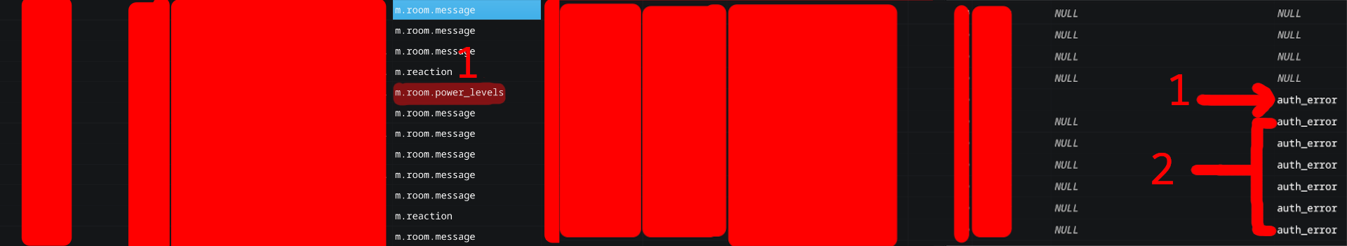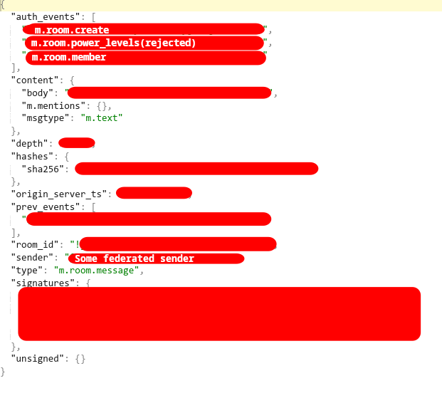 Despite all that, there are still 2 edge cases for this theory, one is matrix.org event still being accepted together with 1 independent homeserver. Another event sent from our homeserver is still being accepted in federation in spite of the auth_error chain going on.